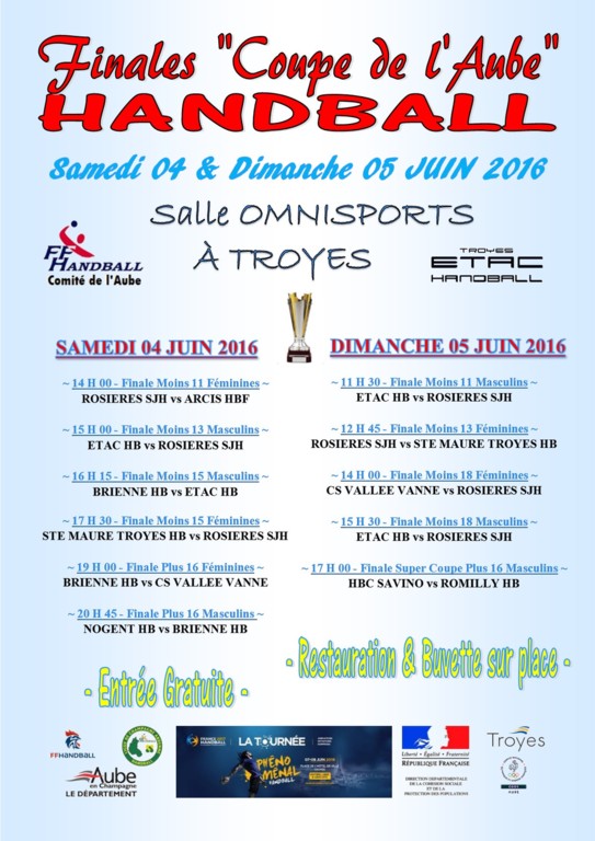 Le samedi 4 juin, 3 équipes du Brienne Handball se rendront à la Salle Omnisports de Troyes pour tenter de remporter la Coupe de l'Aube dans leur catégorie. Alors chers supporters du BHB, réservez votre samedi et venez les encourager !