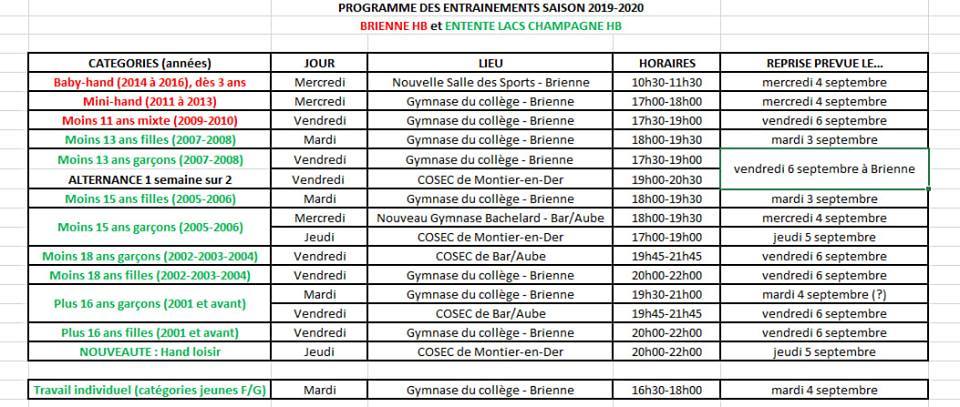 Vous trouverez ci-dessous le tableau récapitulatif des entraînements pour toutes les catégories de Brienne et de l'entente pour cette saison 2019-2020. Avec quelques précisions :